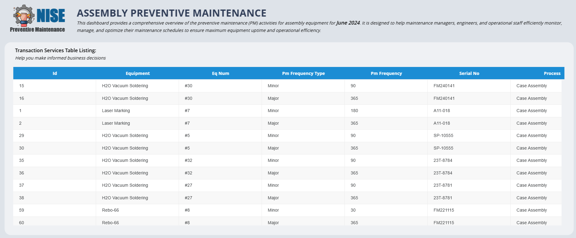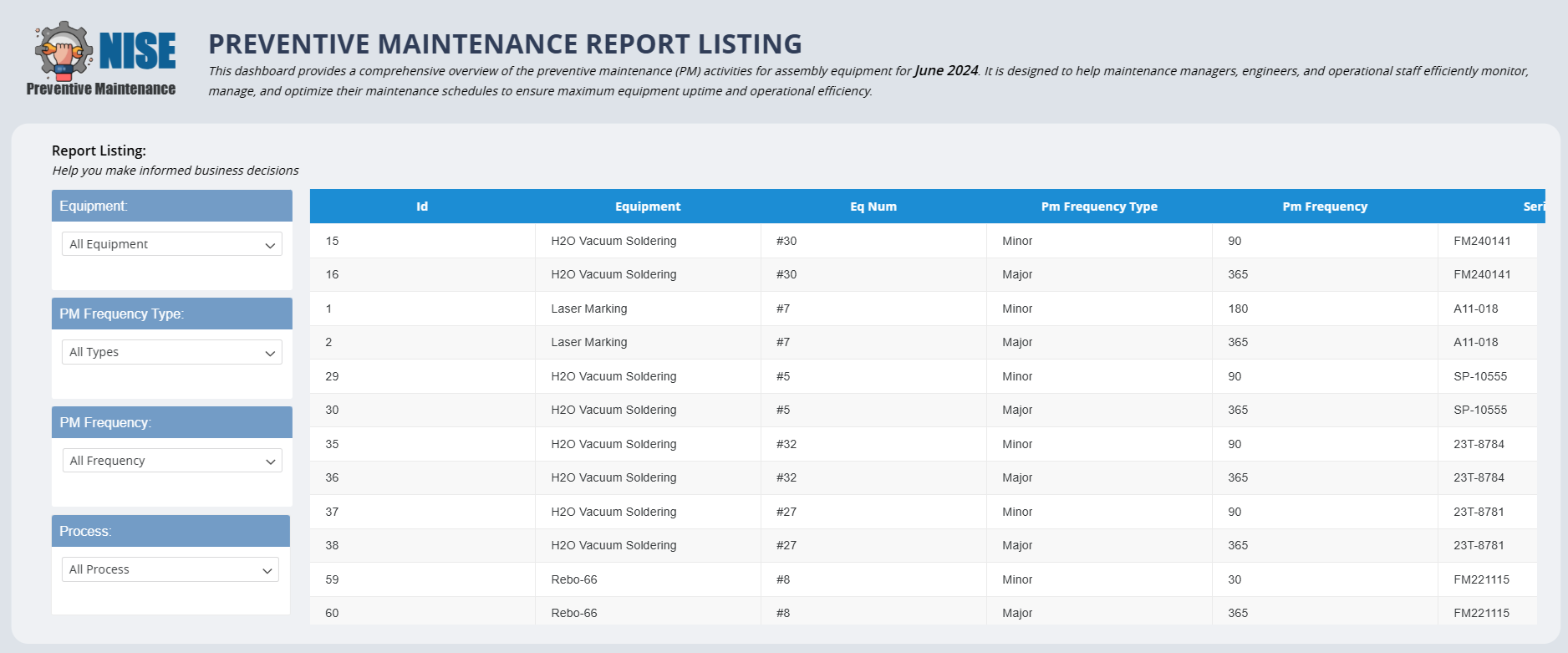 Provides a comprehensive insights of the preventive maintenance activities, schedules of maintenance tasks, equipment performance, and the overall health of systems. **Click the image to expand